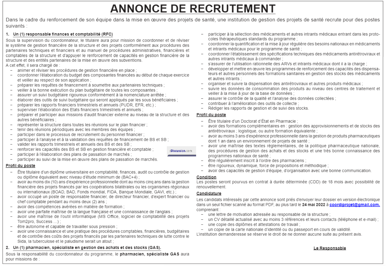 – Un (01) Pharmacien, Spécialiste en gestion des achats et des stocks (GAS)