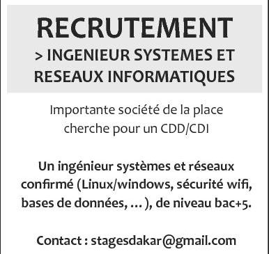 Une société de la place recrute 01 Ingénieur Systèmes et Réseaux Informatiques en CDI